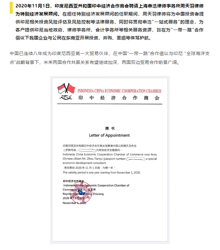 周天羽律师对印度尼西亚国情有较为全面深入的了解,因针对印尼在中国“一带一路”合作倡议下的经济发展结构创新建议得到了印尼当地政府机构的充分认可,特此获聘。